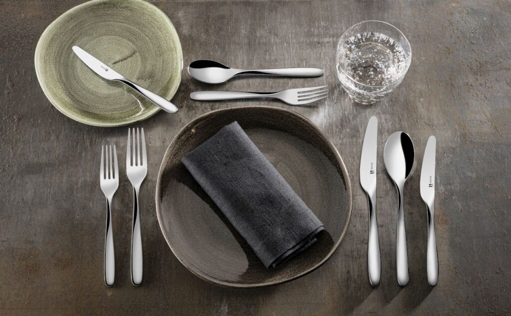 De plaatsing van het bestek volgt een logische volgorde: van buiten naar binnen. Dit betekent dat het bestek voor de eerste gang aan de buitenkant ligt en het bestek voor de laatste gang het dichtst bij het bord. De vorken (zoals de dinervork en de saladevork) liggen links van het bord, terwijl de messen (dinermes, vismes) en lepels (soeplepel) aan de rechterkant liggen. Een belangrijke detail is dat de snijzijde van de messen altijd naar het bord toe moet wijzen. Boven het bord, horizontaal geplaatst, liggen de dessertlepel en -vork. De lepel wijst hierbij met de kom naar links, en de vork met de tanden naar rechts, zodat ze na het hoofdgerecht gemakkelijk naar de juiste kant kunnen worden geschoven.